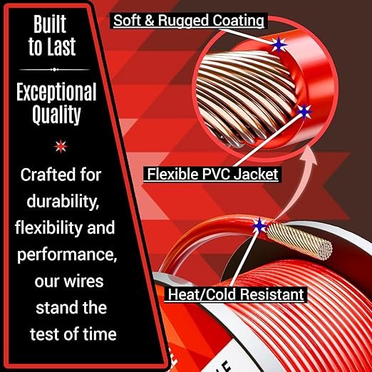 • Flexible 14 gauge auto wire, insulated 14 gauge wire, and jacketed in PVC; Rated 158 degrees Fahrenheit (6 to 80 Volts)