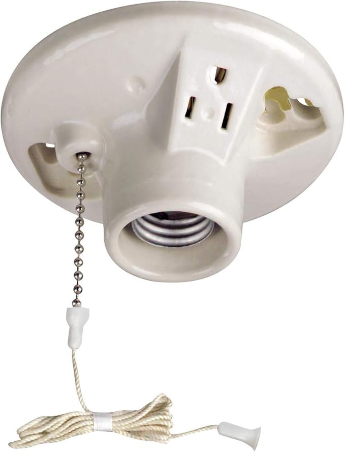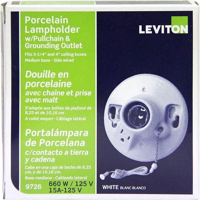 Leviton 9726-C One-Piece Glazed Porcelain Outlet Box Mount, Incandescent Lampholder, Pull Chain, Top Wired, White