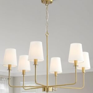 6-Light Farmhouse Chandelier with Brushed Gold Finish & Linen Shades, E12 Base Rustic Ceiling Light Fixture for Kitchen Island, Dining Room, Entryway, Industrial Farmhouse Lighting